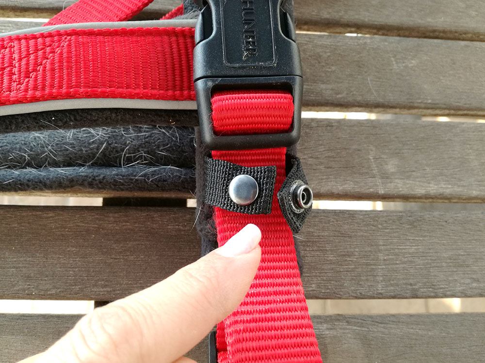 Esta pieza es una «pequeña tira» con un simple botón de presión, lo que hace es fijar la correa del vientre con el resto del arnés, de este modo cuando nuestro peludo da un tirón o hace un giro, todo el arnés se mantiene en su sitio, sin deformarse ni hacer tensión en otra parte del cuerpo que pueda dañar las articulaciones.