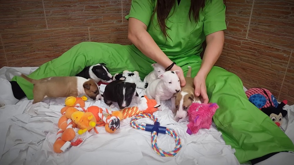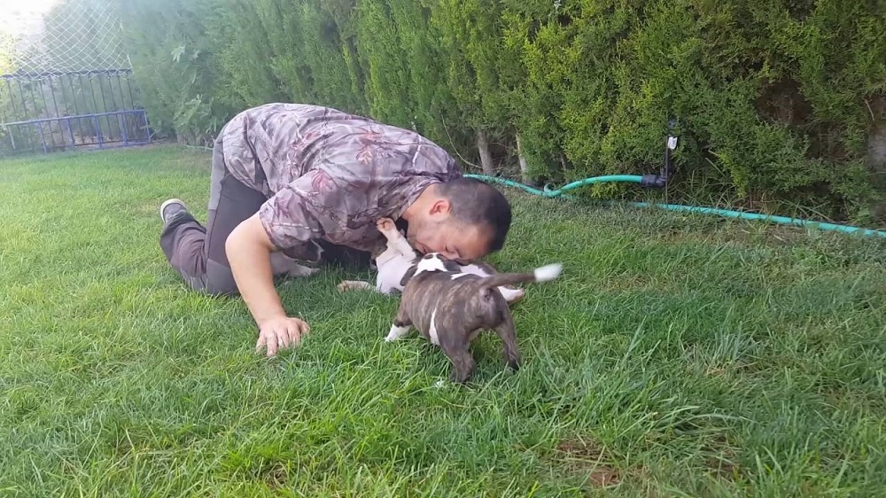 Dedican hoooooras y horas a la socialización organizando grupos de juegos equilibrados, con mamis «retiradas» que enseñan a los más peques, trabajan el carácter, cuidan de las líneas de sangre para mantener esa pureza juguetona y amigable de la raza Bull Mini. Todos sus machos y hembras siguen con ellos aun después de retirarse, son familia.