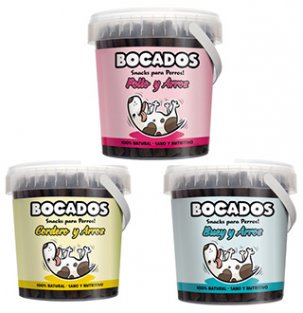 1.2 Dentro de los snacks Bocados encontraremos tres sabores distintos, cordero, pollo y buey, todos ellos en combinación con arroz partido. La característica principal de los sancks Bocados es que son una barritas con un 20% de humedad que podemos ir partiendo con la mano según la demanda. Lo que los hace perfectos para el paseo ya que no tienes que ir con la mano llena de snacks, que se te caigan por el camino o ir cogiendo cada dos por tres de la bolsita de chuches.