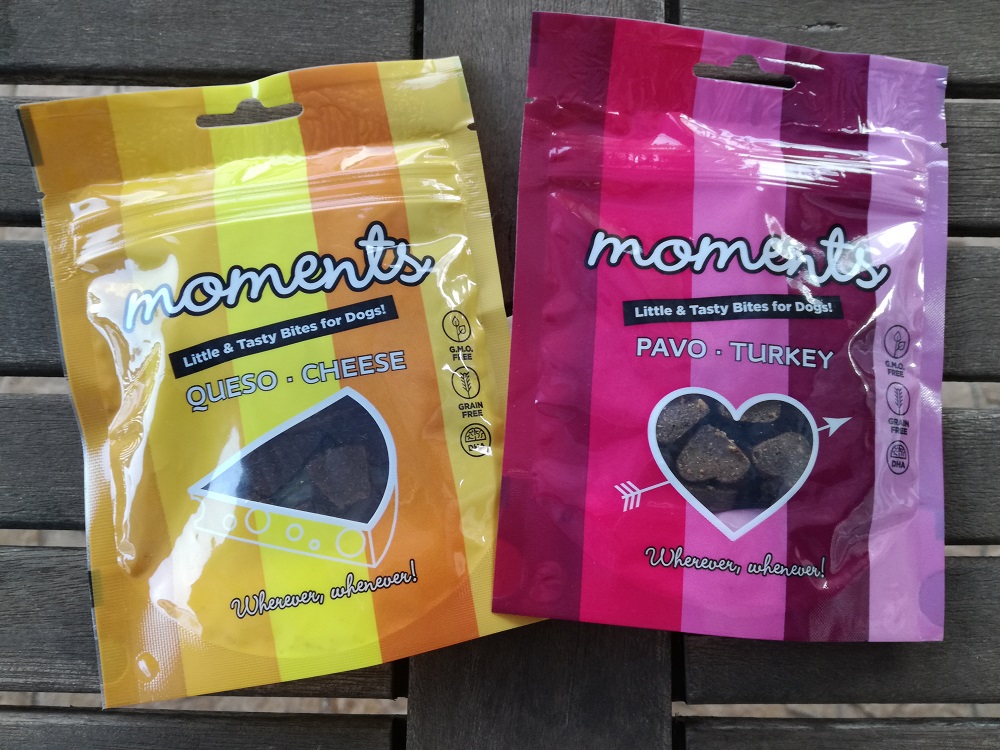 De Moments puedo decir que son una locura, sobretodo los de queso y los de salmón, son tiernos, son aromáticos, son jugosos y se parten fácilmente con los dedos. Los he utilizado tanto para entrenar Agility con Django como simplemente un premio «porqué yo lo valgo».