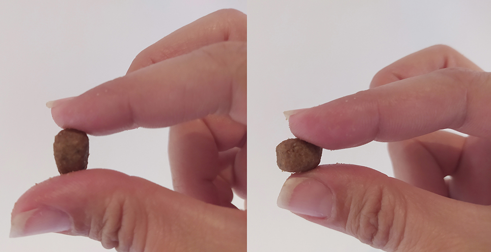 La croqueta, aunque no es especialmente pequeña, sí es muy masticable y tiene un tamaño intermedio que no le ha sido nada difícil morder.