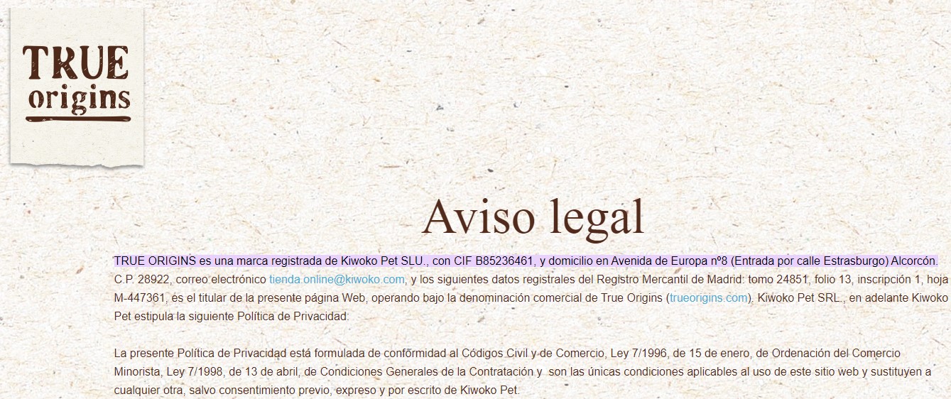 Sí, lo es… así de directa os lo digo 😅. Es tan sencillo como ir a la página web de True Origins, apartado Aviso Legal y allí encontraremos el siguiente texto: