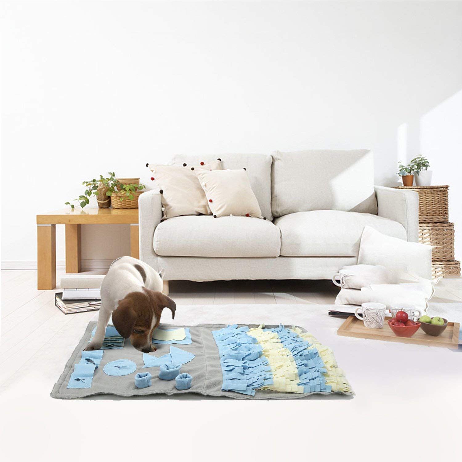 Se podría decir que una manta olfativa o snuffle mat hace la misma función que el juego de searching en la calle, a menor escala por supuesto, pero igual de efectiva, únicamente debemos esconder pequeños premios dentro de ella y nuestro amigo debe encontrarlos olfateando.