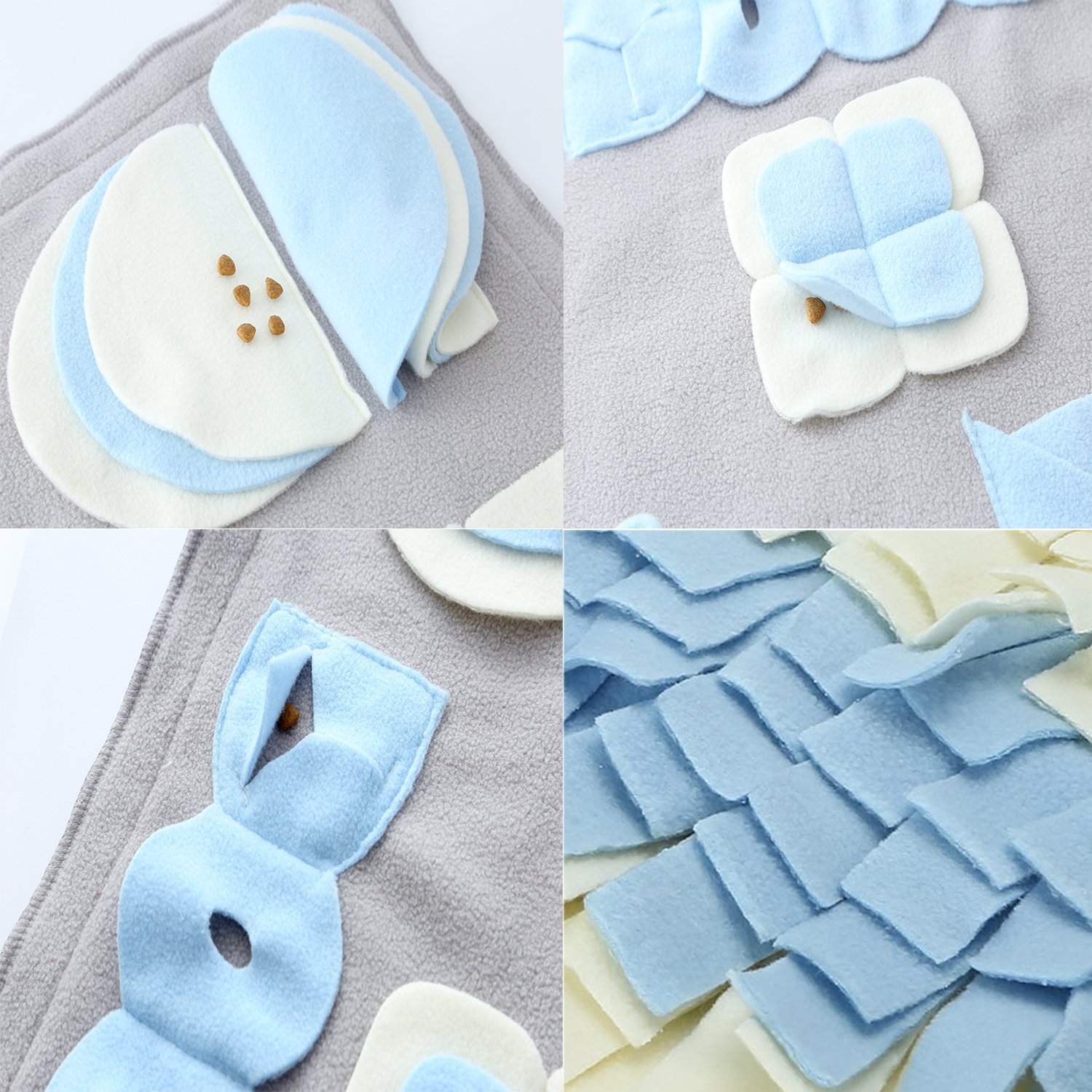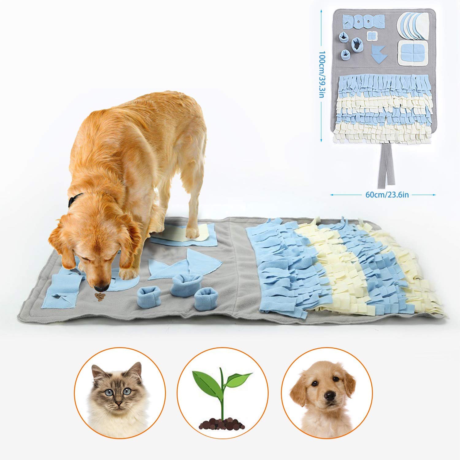 La mejor Manta Olfativa o Snuffle Mat que he encontrado en Amazon es esta, mide 100cm x 60 cm y tiene distintas zonas de olfateo.