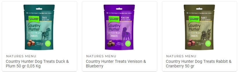 Gama Country Hunter: bolsas de 50gr de nuggets liofilizados con un 60% de carne fresca + 40% de verduras y hortalizas, sin cereales y bajas en grasa.