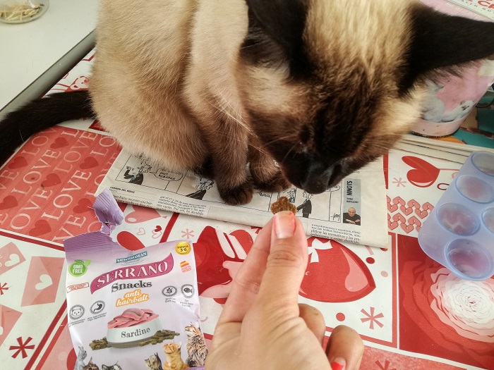 Os dejo la foto de Mixa probando los de sabor Sardina. Mixa es la gatita siamesa de una amiga, ya es mayor y cada vez le cuesta más comer, su humana siempre me dice que no se termina su ración y que anda cambiándole el pienso cada dos por tres porque pierde el apetito, sin embargo, con los Serrano snacks de mediterranean no perdonó, le encantan y le abren el apetito!!