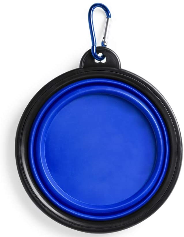 - Bowl plegable para mascotas en resistente material TPR. Diseñado para sólidos y líquidos, con 450ml de capacidad y mosquetón de transporte metálico a juego