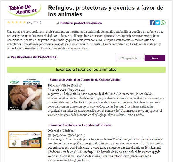 El Tablon de Anunicos sobre eventos a favor de los animales pertenece a un complejo aun mayor, la web https://www.tablondeanuncios.com, un lugar en el que encontraremos artículos de segunda mano, ofertas de empleo, anuncios de oposiciones, viajes, inmuebles… y por supuesto el apartado que hoy nos ocupa, el mundo solidario de las mascotas.